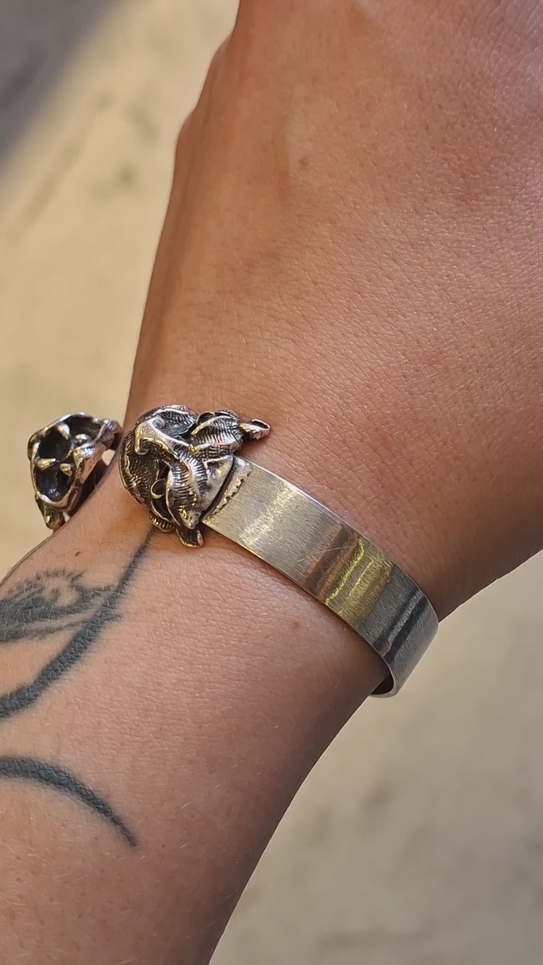 With hand-carved dragon heads, this piece captures the essence of power and distinction. Its flexible fit molds to your wrist, and every handcrafted detail tells a story of authentic craftsmanship.